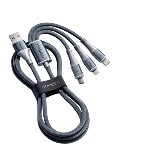 CABLE DE CARGA RÁPIDA 3 EN 1 ROMOSS 100W, CABLE DE CARGA MICRO USB, LIGHTNING, TIPO C - CB253A